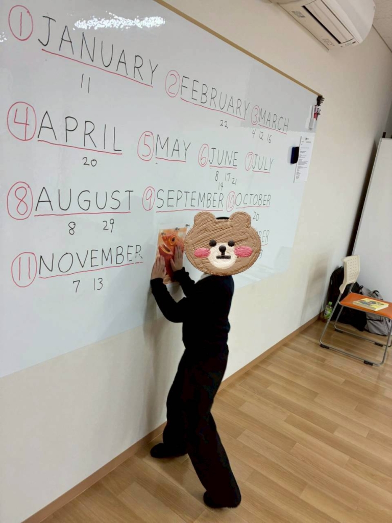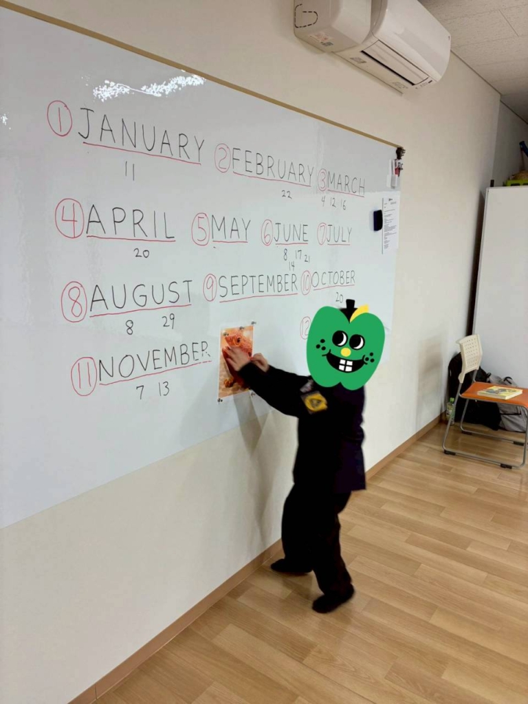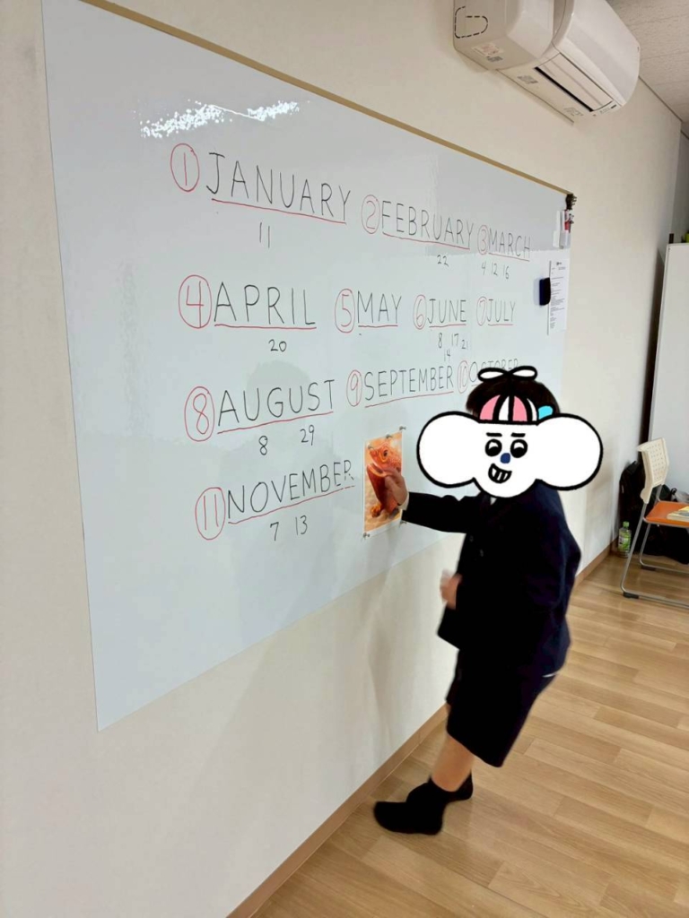 アダム先生と一緒に1~12月の英語の読み方の練習をしました。