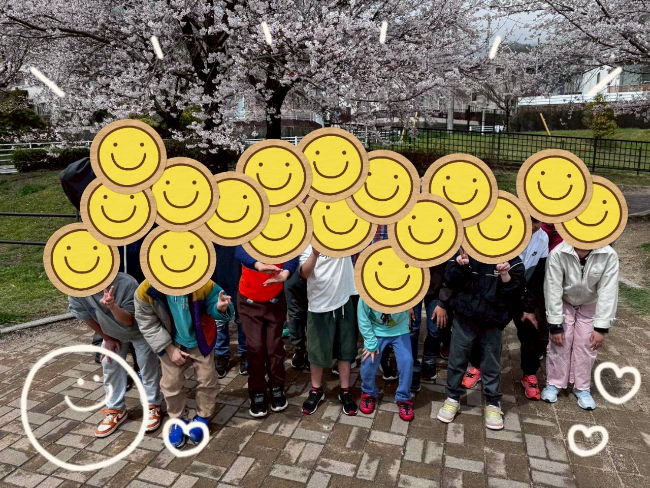 満開の桜の木の下でみんなで記念写真を
