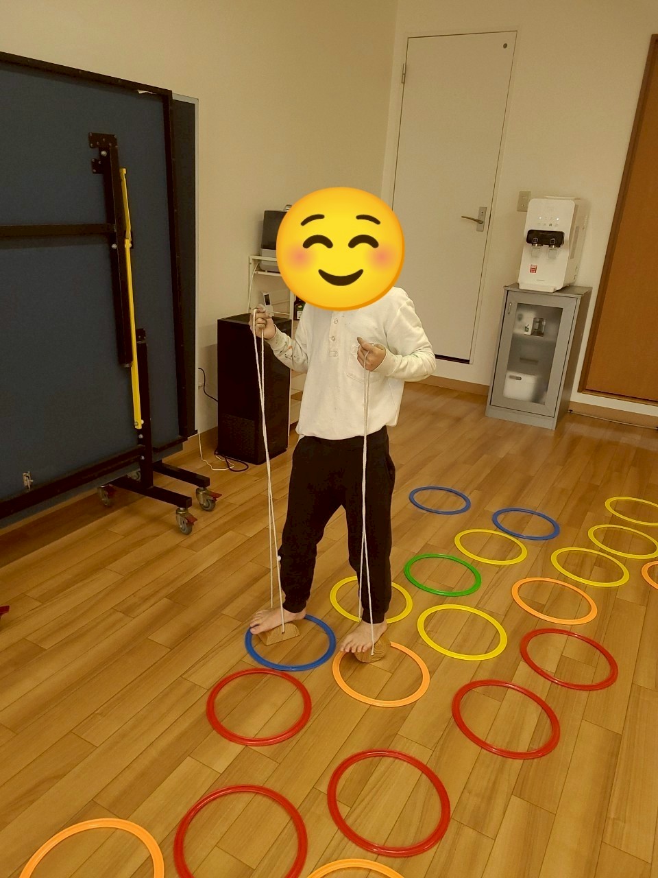 ぽっくりを使ってフープの中を歩く練習など