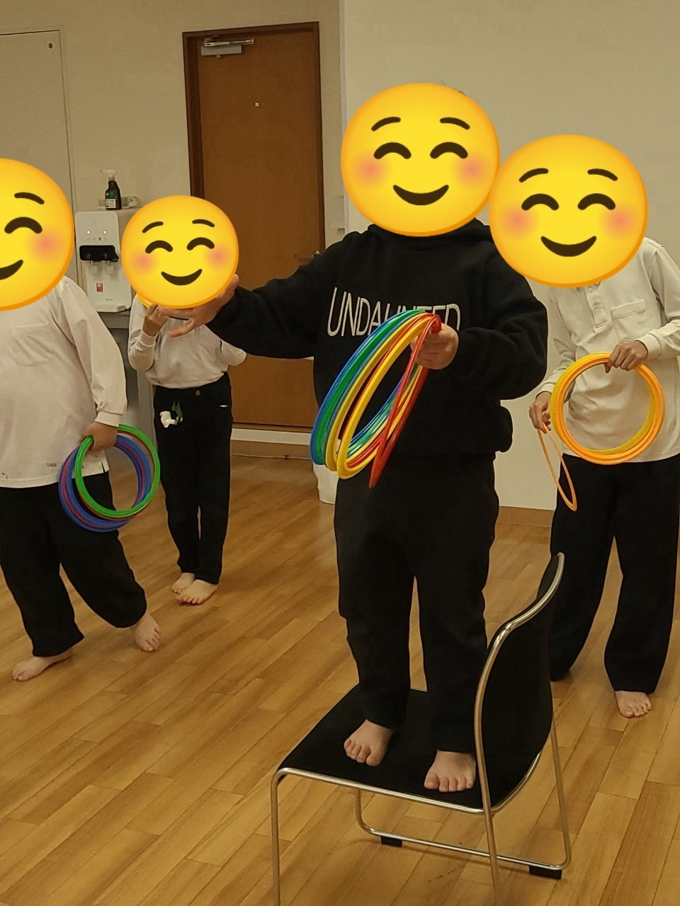 準備体操のあとにロープを使ったバランス歩行の練習や
