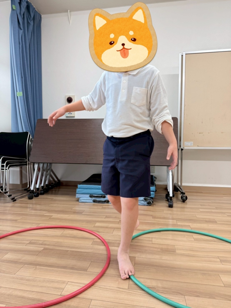 フープを並べてその上を歩いて渡り