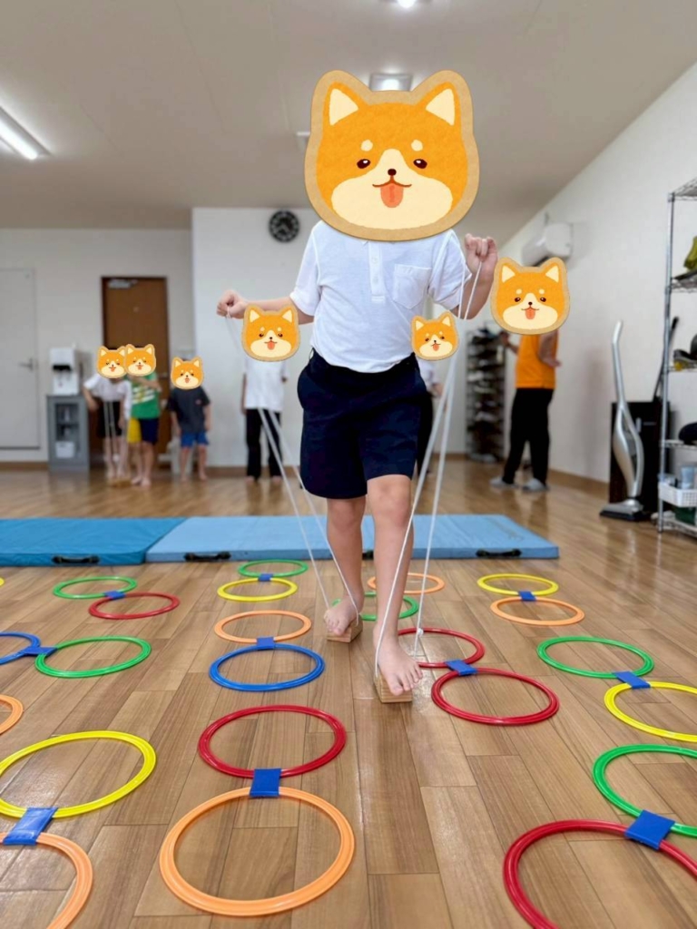 まず、ぽっくりでマットの上を進み、輪っかの中を進んだり