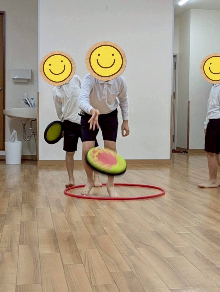 次にフープを床に置き、その中にビーを入れる、的入れをしました🎵