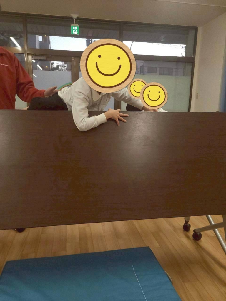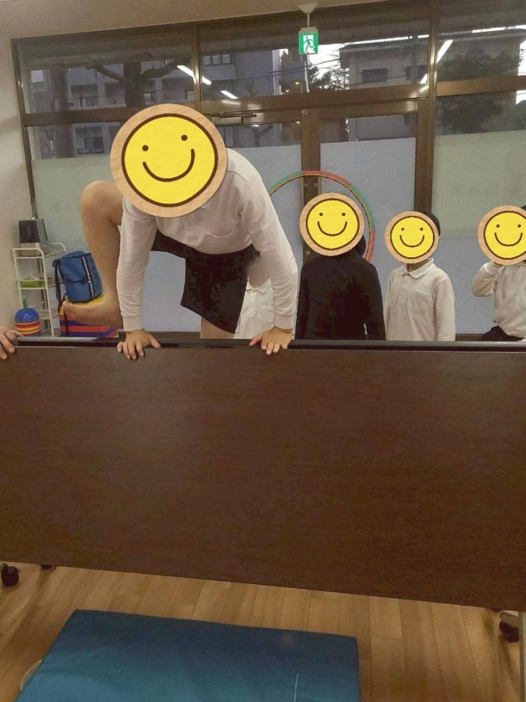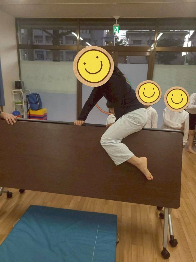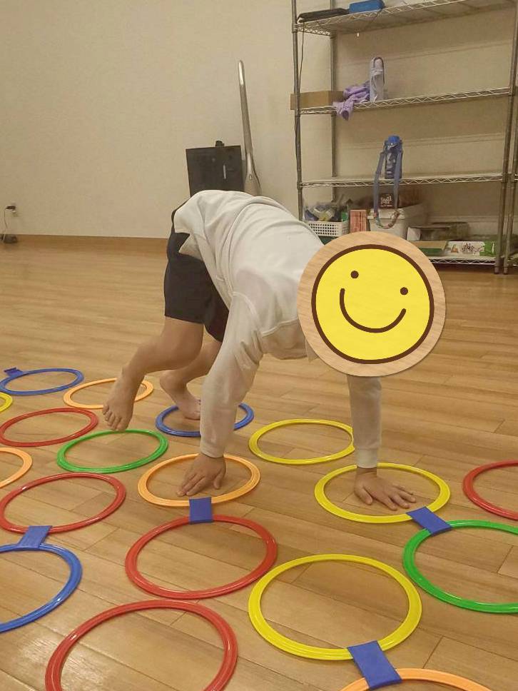 次に机の上にのせるフライビー、輪っかを使って四つ足歩行をしました。