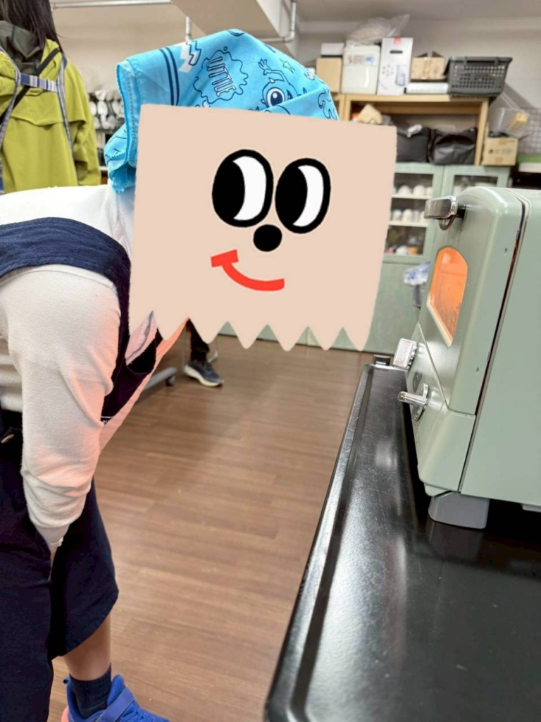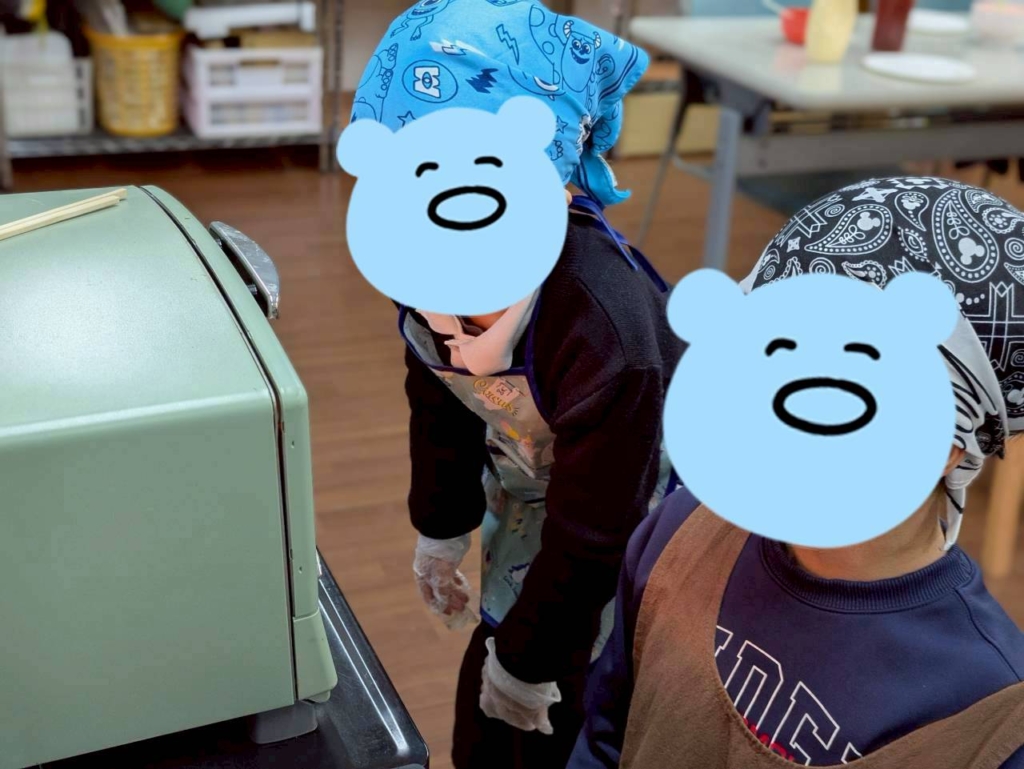 焼きあがるまで子どもたちはトースターの前でにらめっこ