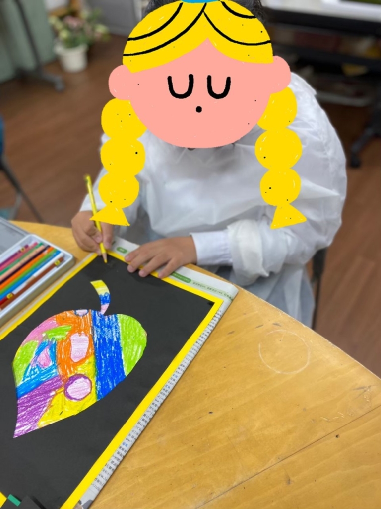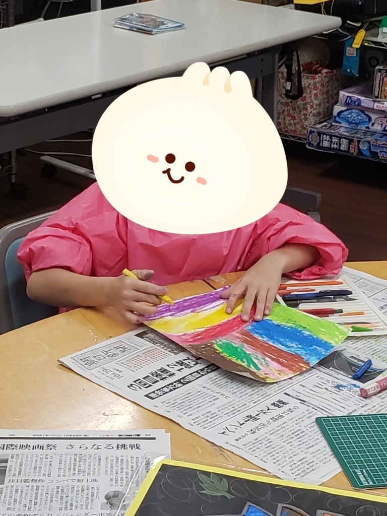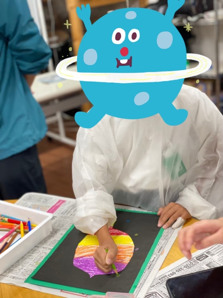 ⑥黒い画用紙に色鉛筆で自由に絵を描いて完成♪