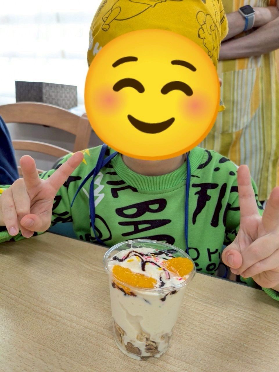 シェイクパフェが完成し、嬉しそうに食べていました!