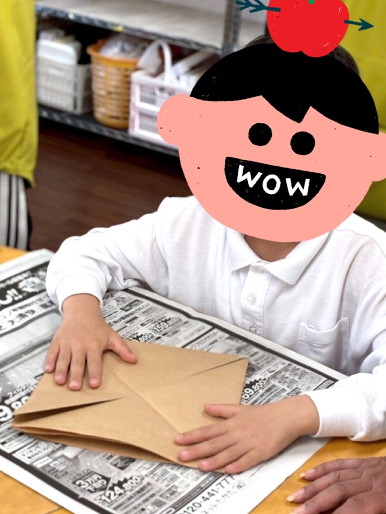 最初に茶色の模造紙で兜を折り、それから先生が