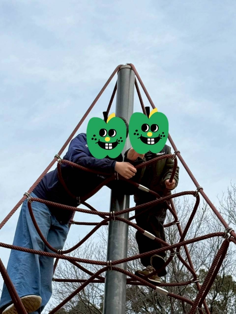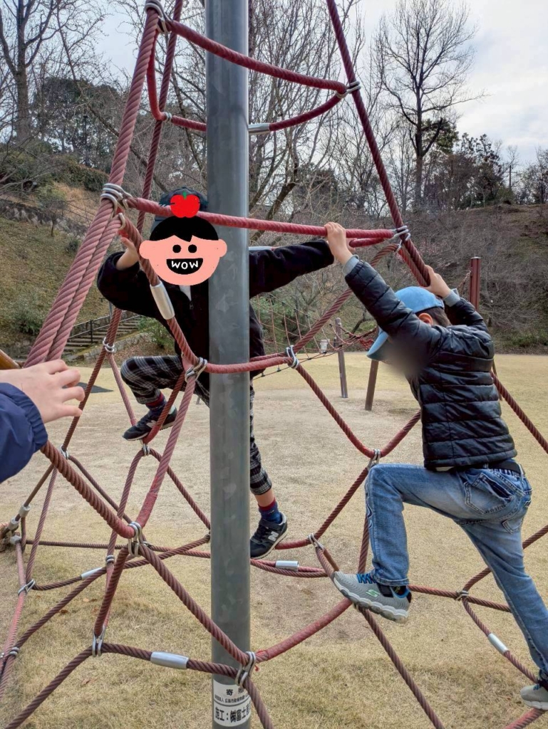 芝生広場ではロープのジャングルジムに登ったり