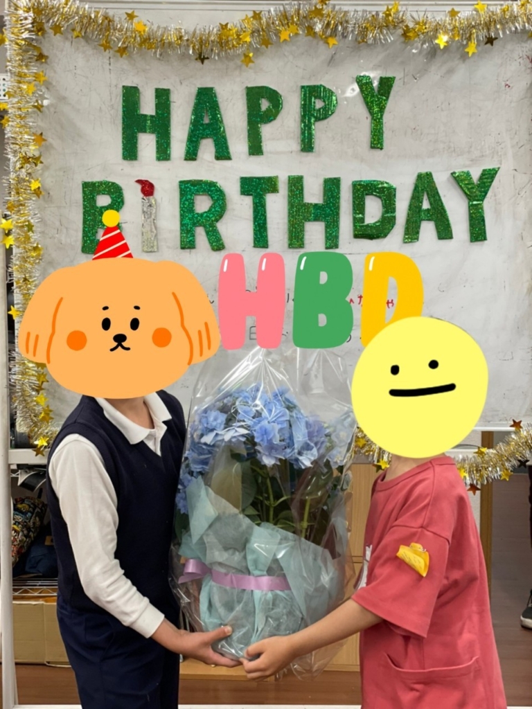 こんにちは、すみれ遊湧です。今日は5月生まれのお友達のお誕生日会をしました♪みんなにハッピーバースデーの歌を歌ってもらい、一緒にケーキを食べました♪その後、綺麗なお花のプレゼントがあり受け取って嬉しそうにしていました♪ -