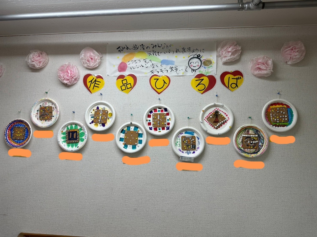 こんばんは、すみれ遊湧です。アート教室の様子です。紙皿を使った壁飾りを作りました♪紙皿とコルクのコースターを使って自由に作品作りに没頭していました(^^♪完成した作品も個性が出ていますね♪ -